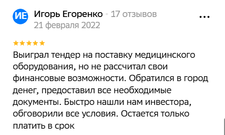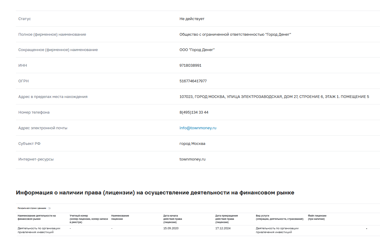Платформа «Город денег» привлекает инвесторов для кредитования бизнеса. На момент написания обзора у нее истек срок действия лицензии. Блоги в соцсетях давно заброшены. Все говорит о том, что фирма закрылась. Единственное, на картах отмечено, что компания работает. Возможно, просто не внесли изменения.