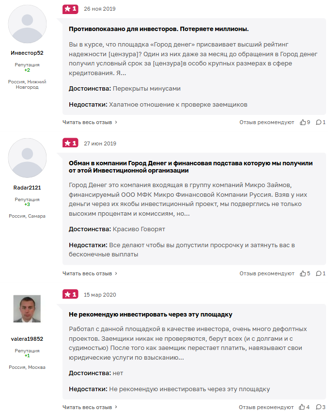 Также есть недовольные инвесторы, которые говорят, что компания плохо проверяет заемщиков. Когда должники прекращают платить, фирма навязывает услуги своих юристов по взысканию. Заемщики же жалуются, что сотрудники вынуждают допустить просрочку, затягивают в долговую яму.
