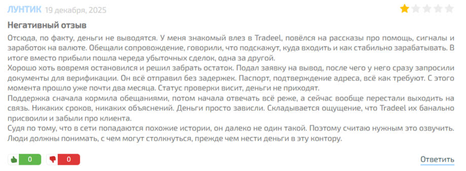 По отзывам, брокер Tradeel ведет мошенническую деятельность. Деньги вывести с сайта не получается. Сначала обещают стабильный заработок. Потом заключаются якобы прибыльные сделки, но по факту только имитируется торговая деятельность. Попытки вывести средства не приносят результата. Аккаунт пользователя блокируется, поэтому он не может получить свои деньги. Положительные отзывы брокер не заслужил.