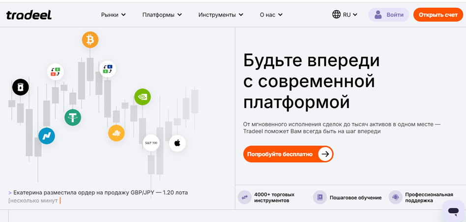 «Традеел» – брокер, который предоставляет профессиональные консультации по технологиям и финансам. Клиентам открывается доступ к глобальным рынкам, в которые входит более 4000 активов. Для торговли используется платформа WebTrader, которая работает стабильно и моментально исполняет сделки. Заключать сделки можно как в браузере, так и через мобильную версию.