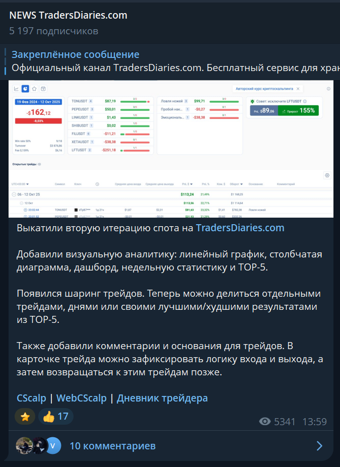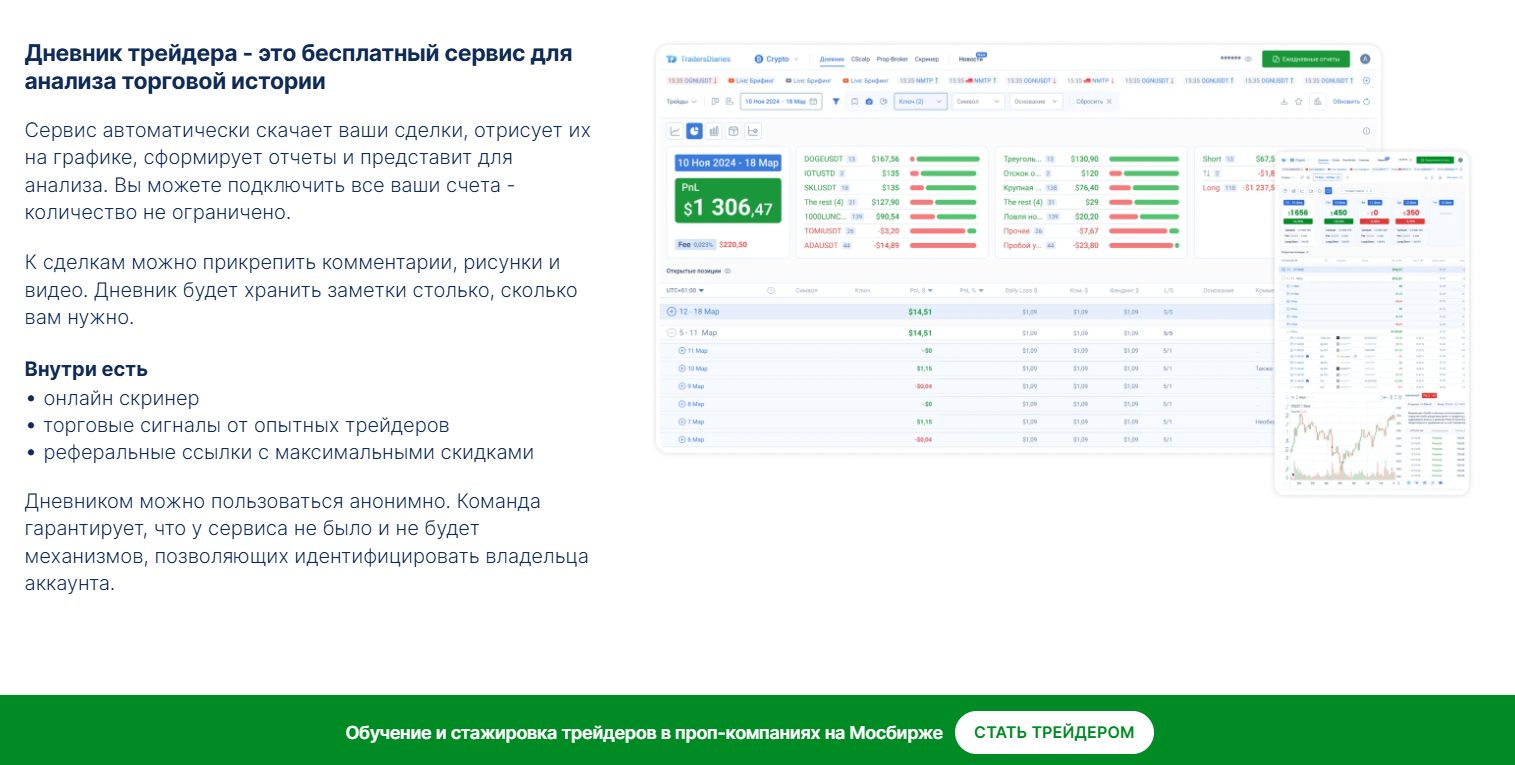 Проект создан командой, которая разработала торговый терминал CsCalp, а сервис сам загружает историю сделок с бирж, показывает их на графике и собирает в отчеты, что экономит время. Внутри есть дополнительные бесплатные инструменты, куда входят скринер для поиска криптовалют и торговые сигналы от других трейдеров.