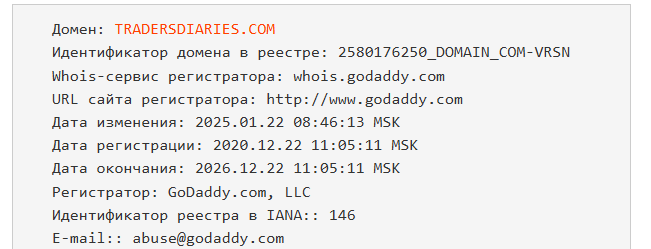 Анализ домена официального сайта Trader Diary показал, что его зарегистрировали в декабре 2020 года, поэтому срок продолжительности можно назвать длительным.