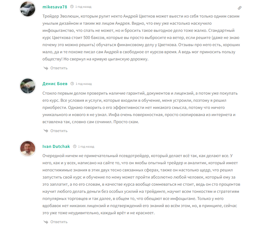 Тем не менее пользователи на независимых форумах в отзывах указывают, что трейдер Андрей Цветков — мошенник, а Trader Evolution сомнительный проект. Часть критики касается отсутствия лицензий, часть — маркетинговых обещаний, где делается акцент на быстром росте депозита. Встречаются жалобы на затянутый формат уроков и то, что без личной дисциплины даже описанные стратегии не спасают от просадки.