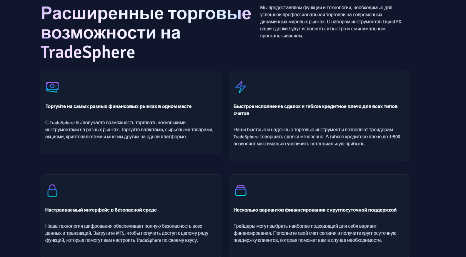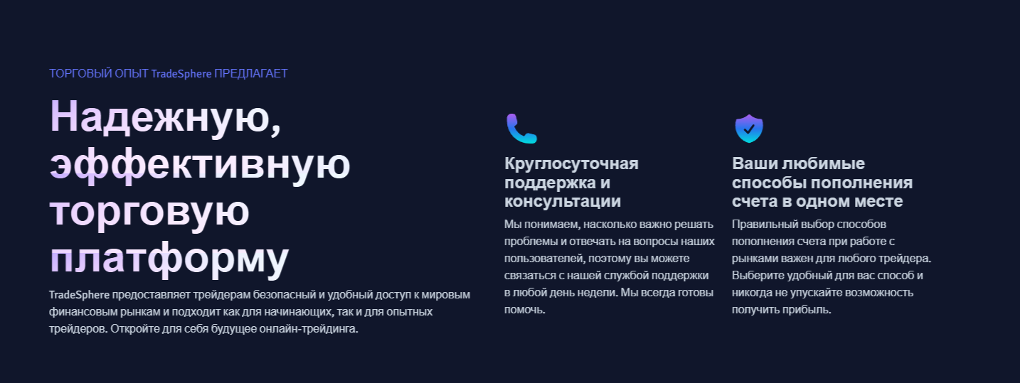 Биржа TradeSphere обещает будущим клиентам торговлю в регулируемой среде, постоянную защиту аккаунтов и расширенные возможности. Под этими возможностями собственники платформы подразумевают:
