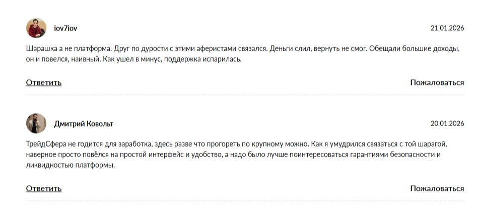 На сторонних ресурсах в мировой паутине можно обнаружить противоположные комментарии о фейковой бирже и вопросы как вернуть деньги с TradeSphere. В отрицательных отзывах упоминаются большие убытки и слив депозитов с легкой руки менеджеров платформы.