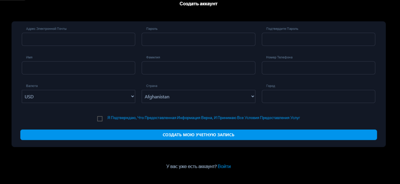 Стать клиентом инвестиционной платформы «ТрадеСфере» могут жители разных государств, кроме США. Сделки на бирже доступны только совершеннолетним гражданам. Доступ к платформе несовершеннолетним ограничивает верификация. Для создания торгового счета пользователю достаточно активировать кнопку «Регистрируйтесь» и заполнить анкету: имейл, имя, фамилия, валюта, пароль, страна и т. д.