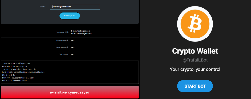 Формально домен Trafali com зарегистрировали в 2018 году, но изначально он не был связан с обозреваемым криптовалютным кошельком. Согласно записям из архивов, еще в середине 2025 года адрес числился за другим порталом, не имеющим отношения к сервису.