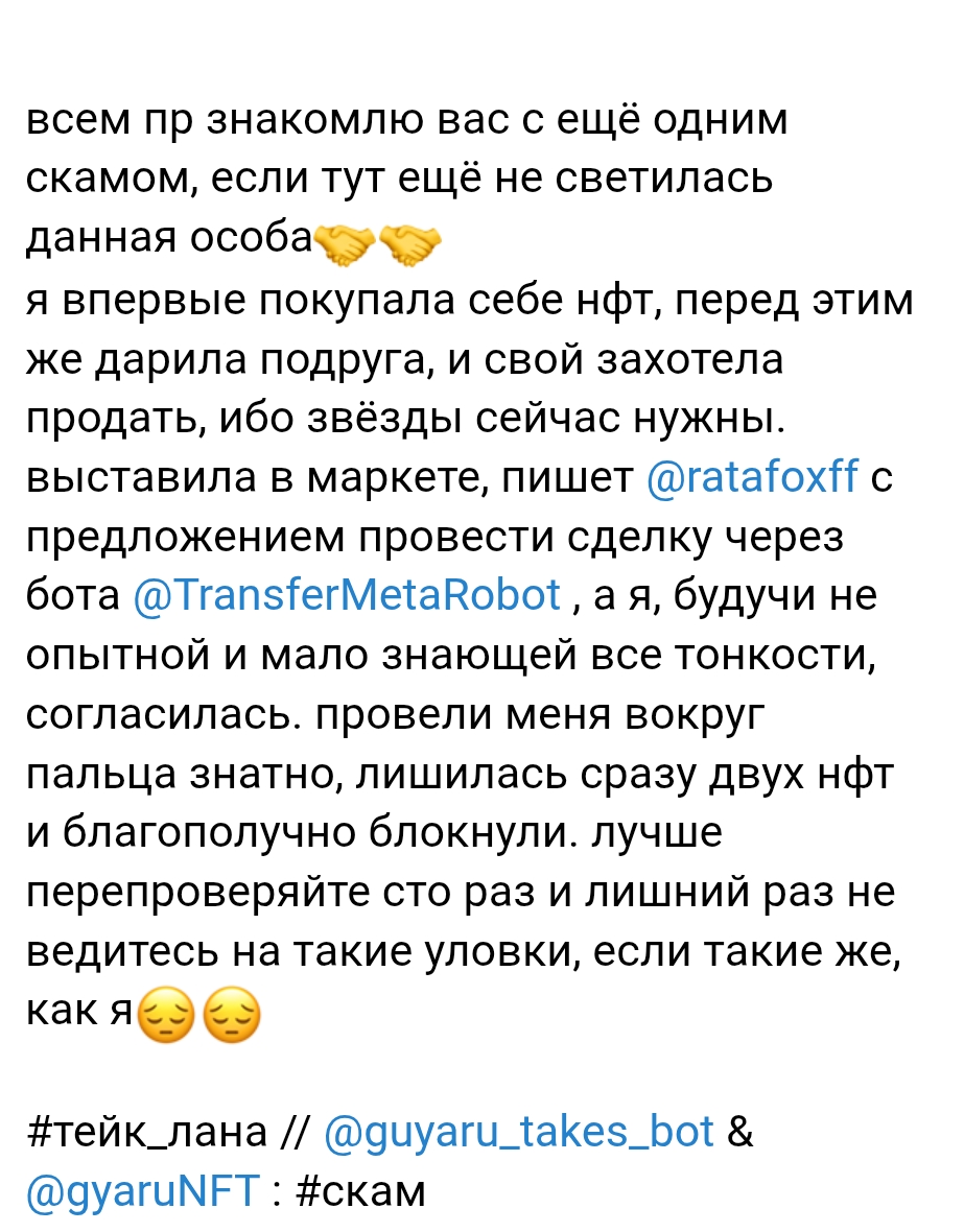 Сомнительных моментов в работе TransferMetaRobot больше, чем плюсов. Судя по отзыву, бота продвигали через личные сообщения: подставной покупатель просил использовать «гаранта» и кидал прямую ссылку. В чате активно торопили и показывали вымышленные отзывы, чтобы не дать времени на проверку сервиса. Как только человек пересылал NFT, права собственности мгновенно менялись в блокчейне TON, и вернуть актив было уже физически невозможно.