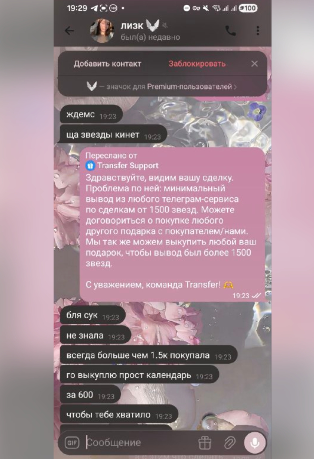 Также пользователь указывает никнейм @ratafoxff и призывает опасаться этого человека, ведь последний убедил его воспользоваться ботом и заблокировал после получения NFT. Кроме того, на форумах вроде Scam Finder и в чатах по кибербезопасности бот давно висит в черном списке. Отдельно стоит отметить фейковую аватарку службы Transfer Support, сделанную, чтобы повысить доверие.