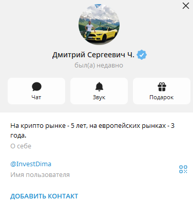 Аккаунт трейдера в Тг (InvestDima) активен. В описании также указано, что автор занимается трейдингом вот уже 5 лет.