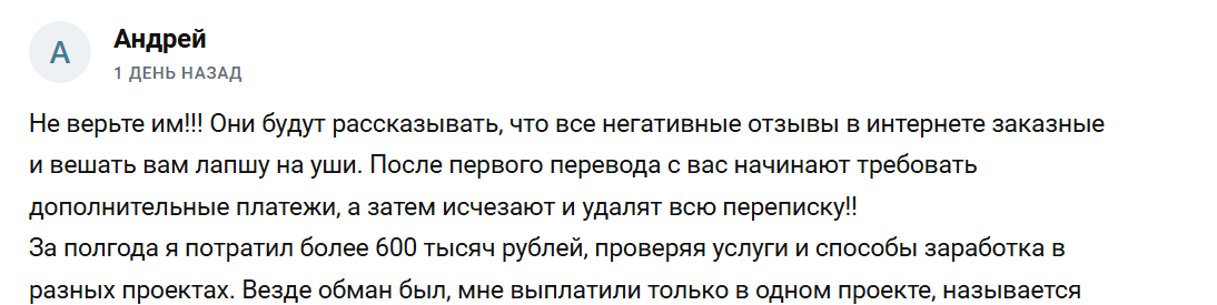 При этом как отмечают пользователи в отзывах о Трейдер Дмитрий Сергеевич, проект связан с обманом. Схема развода не заканчивается только на том, что у человека забирают его депозит. В процессе раскрутки автор поддерживает диалог, рассказывает об успехах. Но когда человек уже планирует забрать деньги, ему сообщают о необходимости обязательных платежей. Якобы вывести средства нельзя без уплаты налогов, комиссий сверху. Под подобными предлогами из жертвы просто вытягивают гораздо больше денег. Если же человек сомневается или напрямую отказывается, то его начинают запугивать проблемами с законом, блокировками счетов и т.д.. Разумеется, угрозы пустые. Если жертва идет на поводу, то остается ни с чем.