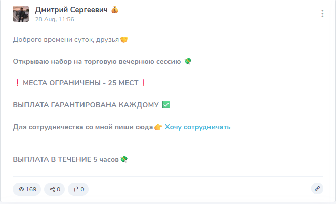 Хотя автор и заявляет о своем большом опыте в трейдинге, вся суть его предложений сводится к обычной раскрутке депозита. Данную услугу в подавляющем большинстве случаев предлагают мошенники. Дмитрий, вероятнее всего, не является исключением.