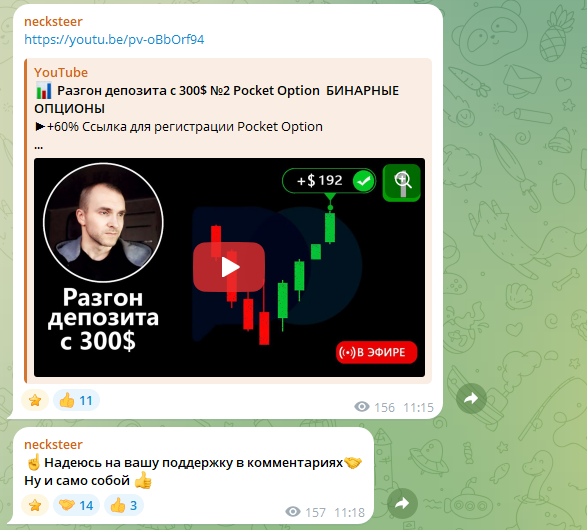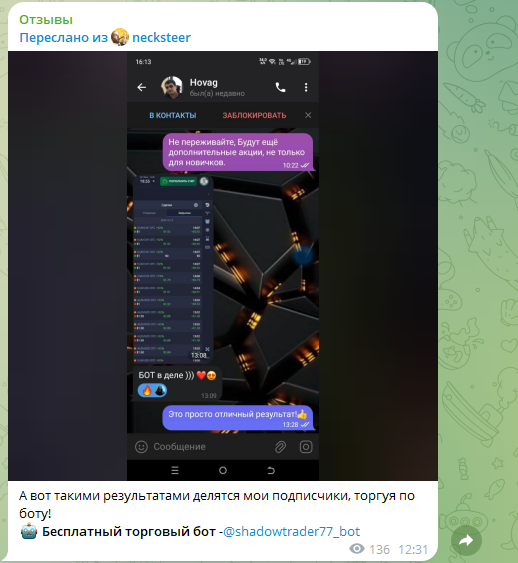 У проекта есть 2 телеграмм-канала с отзывами, речь о блогах @necksteerreviews и @necksteer_prize, но там очень мало подписчиков. В лентах трейдер выкладывает информацию о своей работе, демонстрирует скриншоты пользователей – на них видны только положительные комментарии, что вызывает сомнения.