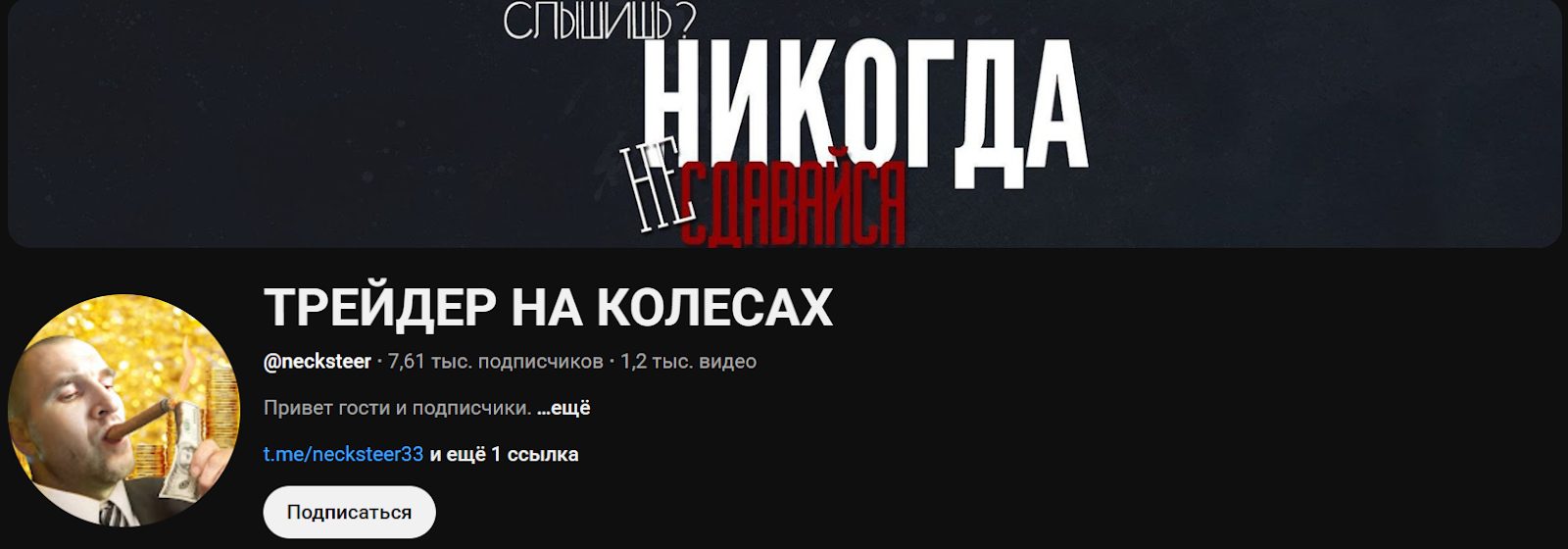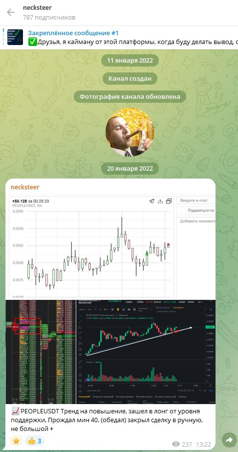 Трейдер ведет телеграмм-канал @necksteer, на который подписано 787 человек – блог существует с января 2022 года. Если судить по статистике, тут также маловероятно использование накрутки, что говорит о честном продвижении автора.