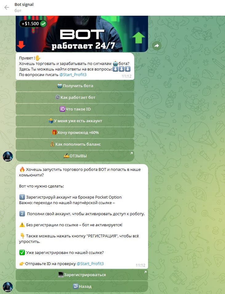«Трейдер На Колесах» зарабатывает на реферальной программе, он просит подписчиков регистрироваться по его ссылке, за что дает им бесплатные сигналы. Всю информацию об этом можно найти на канале, а также в боте @shadowtrader77_bot, доступ к которому никак не ограничивается. Платных услуг в публичном поле не обнаружено, но не исключено, что он продает личные консультации в переписках.