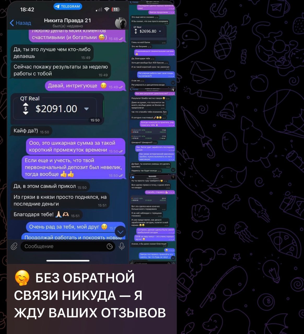 Единственные отзывы на «Трейдинг для всех инвестиции» есть исключительно в самом телеграм-канале. Павел выкладывает скриншоты своих переписок с якобы довольными членами закрытого клуба. Делает он это для привлечения аудитории в свой закрытый клуб.