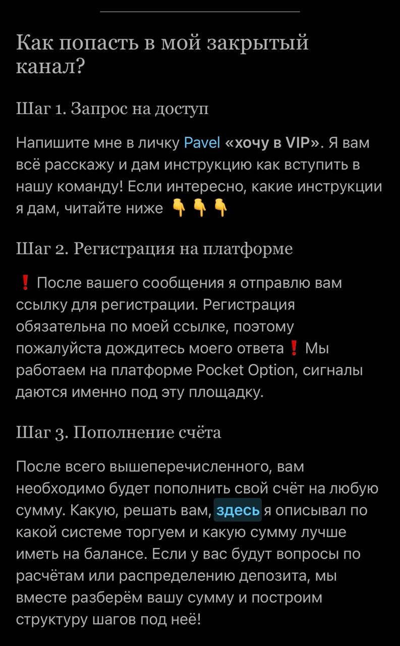 После этого, новоиспеченный участник должен зарегистрироваться по партнерской ссылке на платформе Pocket Option и внести депозит на счет своего аккаунта. Далее, следует ждать сигналов от Павла и получать прибыль.
