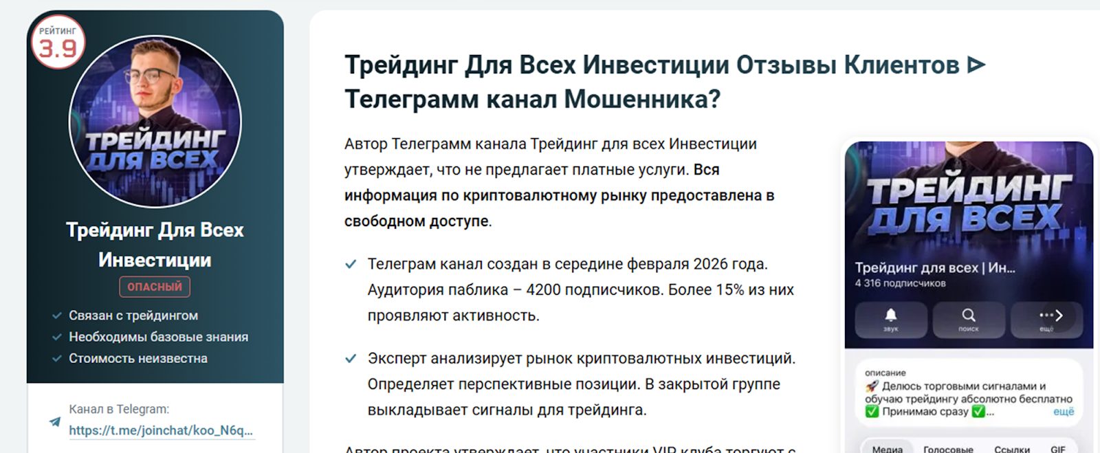 На его канал «Трейдинг для всех инвестиции», созданный в начале февраля 2026, подписано более 4000 пользователей. Но скорее всего это результат накрутки так как львиная часть аудитории – боты, ведь посты просматривают лишь 600-650 пользователей. Комментировать публикации нельзя, такую возможность автор исключил.