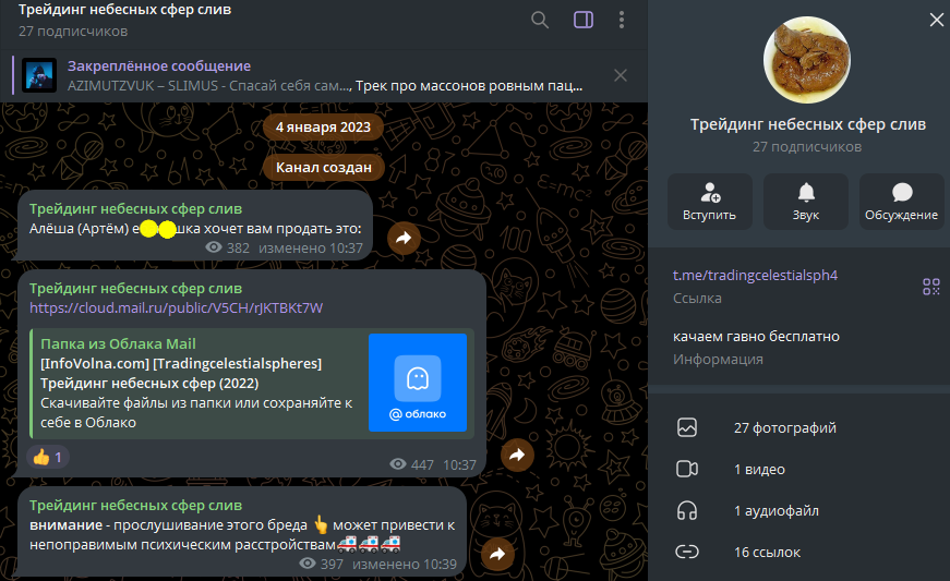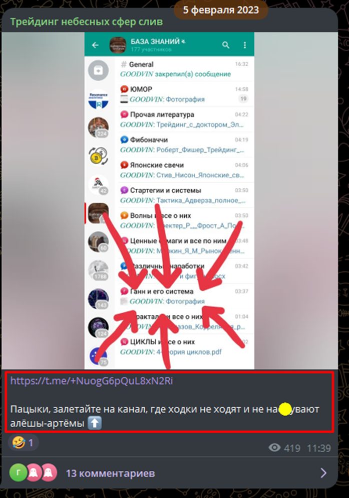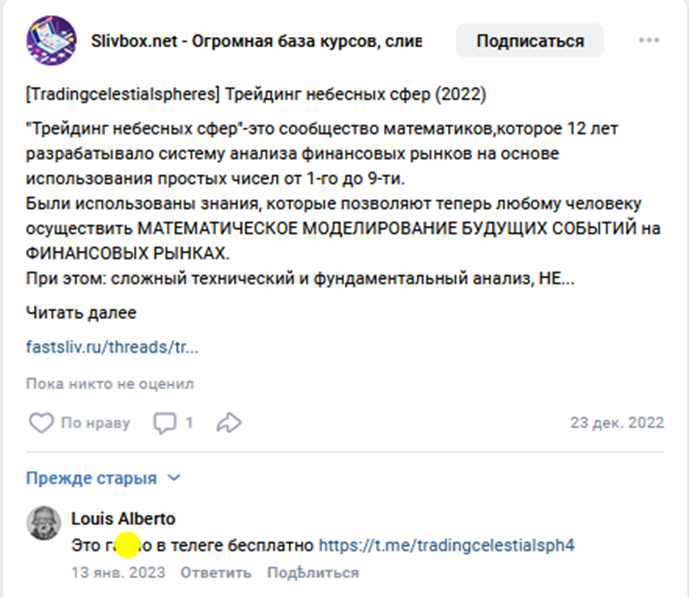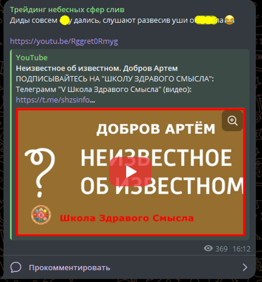Трейдинг небесных сфер Слив – Телеграмм канал анонимного автора, посвященный разоблачению обучающих материалов некоего Артема Доброва. Группа просуществовала около года, среди публикаций – полный пакет курса TradingCelestialSpheres, распространяемый в группе бесплатно. Администрацией канала заявляется, что Академия Трейдинг Небесных Сфер занимается мошенничеством, а ее обучение – пустышка.