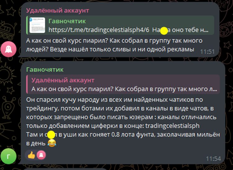 ТГ канал Tradingcelestialsph4 – частный блог, просуществовавший около года. Его целью стал слив уроков Школы Трейдинг Небесных Сферы Артема (Алексея Успенского) и разрушение репутации этого псевдо-коуча. Но в группе также замечена реклама другого ресурса с рекомендациями скачивать или покупать обучение. Доверять таким каналам не стоит, вероятнее всего, этот проект был создан на почве личного конфликта с коучем и недовольства завышенной стоимостью за материал низкого качества.