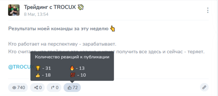 Аудитории комьюнити запрещено общаться между собой, комментарии закрыты. Реакции проставлять можно, но они под постами только радостные. Вероятно, админ сообщества «Трейдинг с Trocux» запретил подписчикам оставлять иные смайлики.