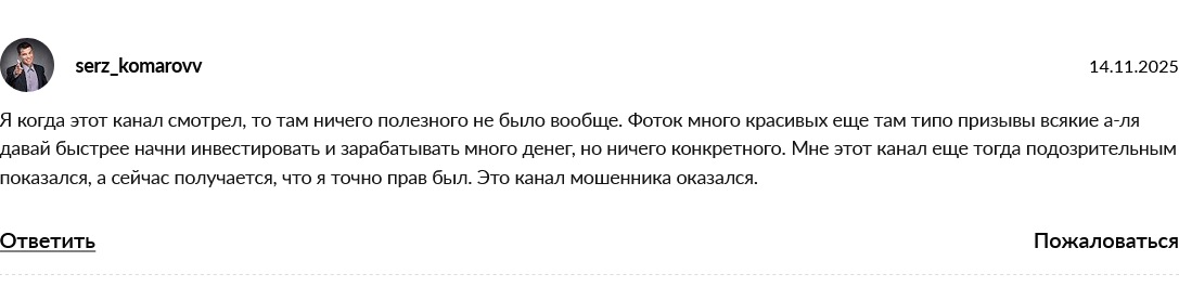 Мы внимательно рассмотрели деятельность трейдера, установили, что никаких данных о нем в интернете нет. Также узнали, что молодой человек продает платные инвестиционные сигналы, но о стоимости таких рекомендаций сведений нет. Рассмотрев отклики подписчиков комьюнити, делаем выводы: