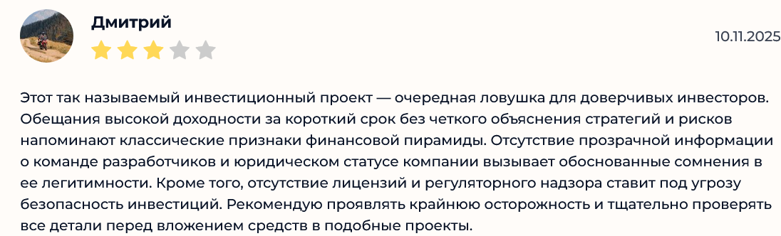 На сторонних площадках отклики клиентов «эксперта» только отрицательные. Люди пишут, что данный проект – очередная ловушка для доверчивых клиентов. Отсутствие стратегий, аналитики, объяснений возможных рисков показывают, что проект – обман.