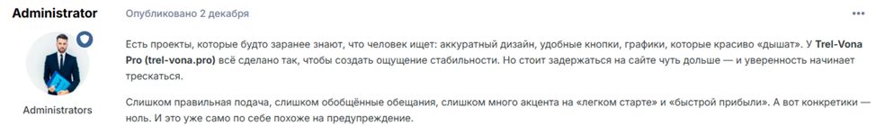 Отзывы о Trel Vona Pro свидетельствуют о ненадежности брокерской компании. На сайте указаны только преимущества: высокие доходы, моментальные выплаты, профессиональные менеджеры, регулирование и гарантия безопасности. Но это только реклама, а на самом деле все не так. На эту площадку поступает много жалоб.