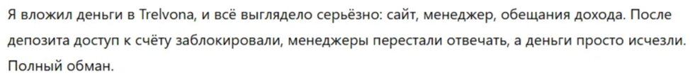 Мы нашли отрицательные отзывы о Trelvona. Этого брокера называют мошенником, поскольку сначала пользователям обещают стабильный и высокий доход, но потом доступ к счету блокируется. Менеджеры не помогают своим клиентам, а деньги просто исчезают без возможности вернуть их.