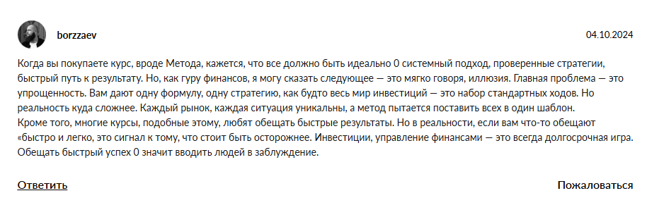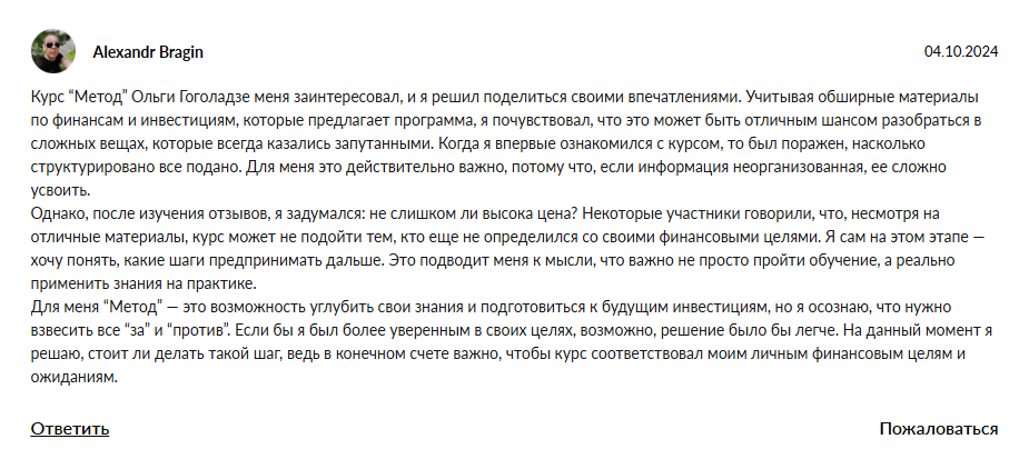 По итогам оценки Ольги Гогаладзе, которая продает курсы по заработку на инвестициях, можно выделить следующие минусы: