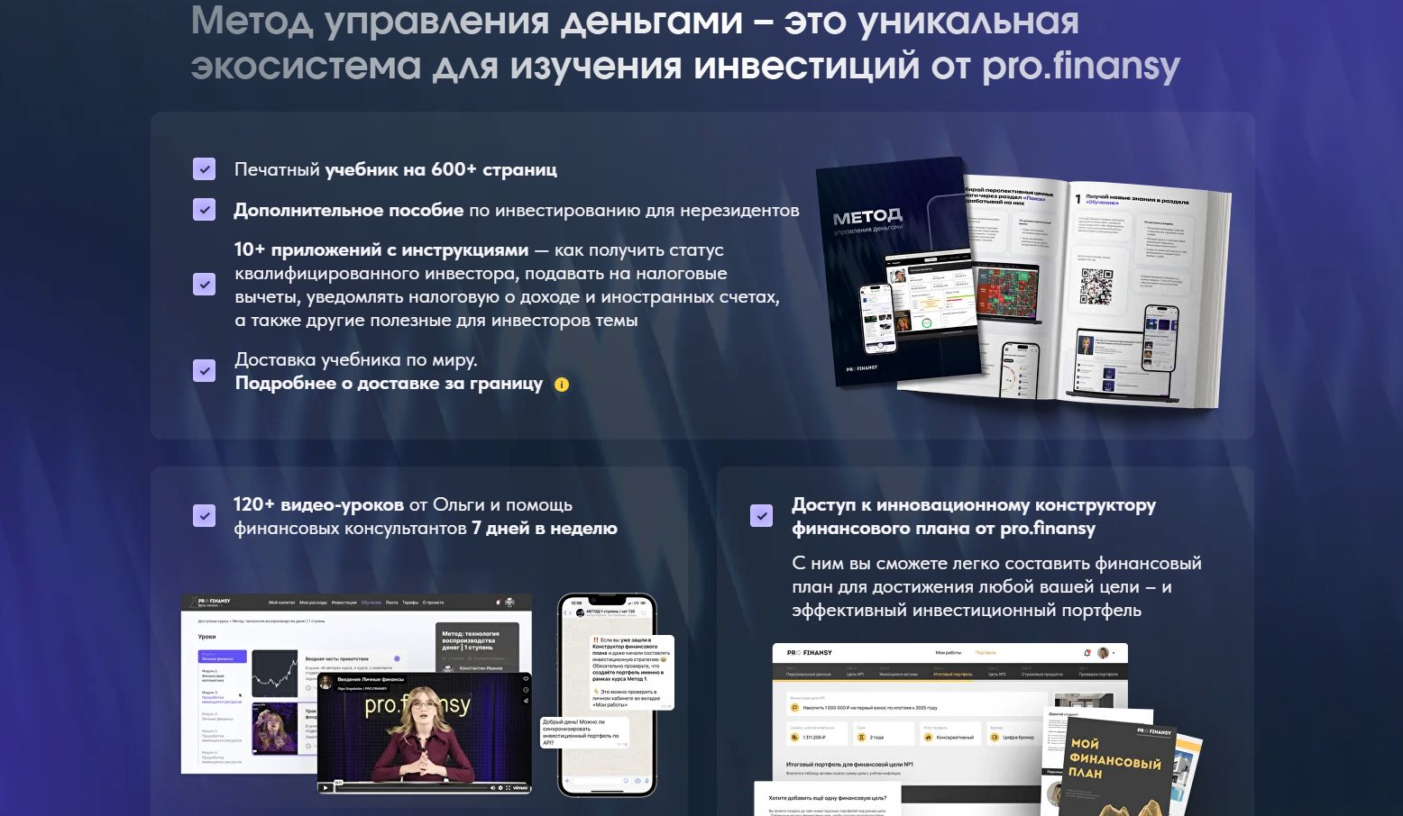 На отдельной странице ProFinansy study Ольга Гогаладзе продвигает свои курсы в сфере инвестиций. Все они проходят в формате онлайн и длятся от 2-3 месяцев. Контент представляет собой как текстовый, так и видеоматериал, а новым ученикам начали поставлять и печатный учебник на 600 страниц. Все курсы якобы ведут квалифицированные специалисты, но судя по тому, как автор любит крутить опыт, здесь и может прятаться развод. Это связано с тем, что имена всех работников засекречены, открыто кураторов на сайте не выставляют.