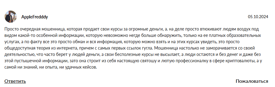 В подобных проектах, где крупные блогеры продают свои курсы и оправдывают их большим количеством успешных учеников, важно грамотно оценить репутацию. Так, проверив тематические форумы в интернете, можно убедиться, что в реальных отзывах Ольгу Гогаладзе называют мошенником, а ее инфопродукты бесполезным материалом, который можно найти на первых страницах интернета. Клиентам не удается заработать и уж тем более выйти на стабильный доход, из-за чего они просто так тратят крупные суммы средств.