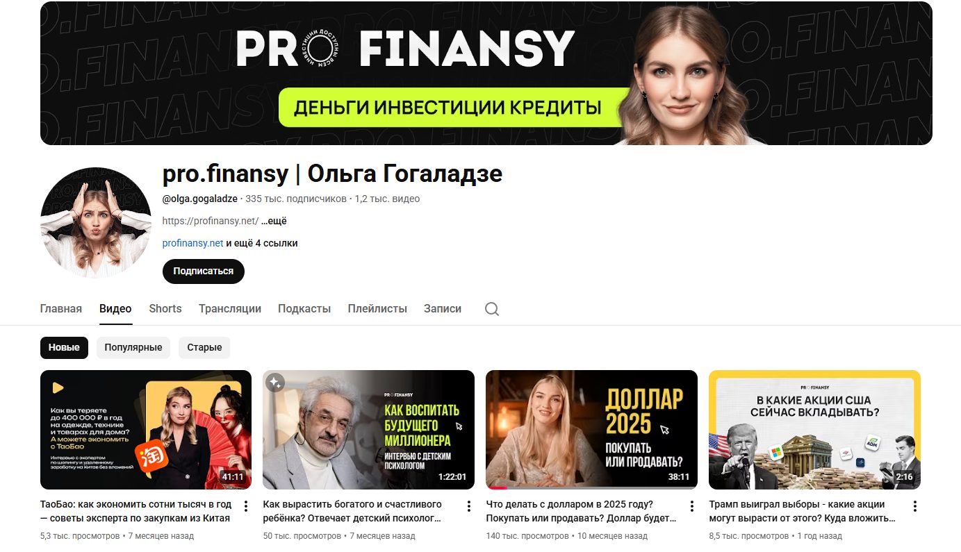 Ольга Гогаладзе это крупный финансовый блогер, по совместительству мотиватор, которая развивает как YouTube, тг каналы Pro Finansy, так и сторонние платформы, которые могут быть напрямую не связаны с инвестором. Ее аудитория превышает 800 000 человек на основных ресурсах, что можно считать хорошим результатом в сфере финансов. При этом многие ее публикации собирают маленькие охваты, нет стабильной аудитории, что говорит либо о накрутке, либо низком качестве контента, который лишь иногда цепляет внимание.
