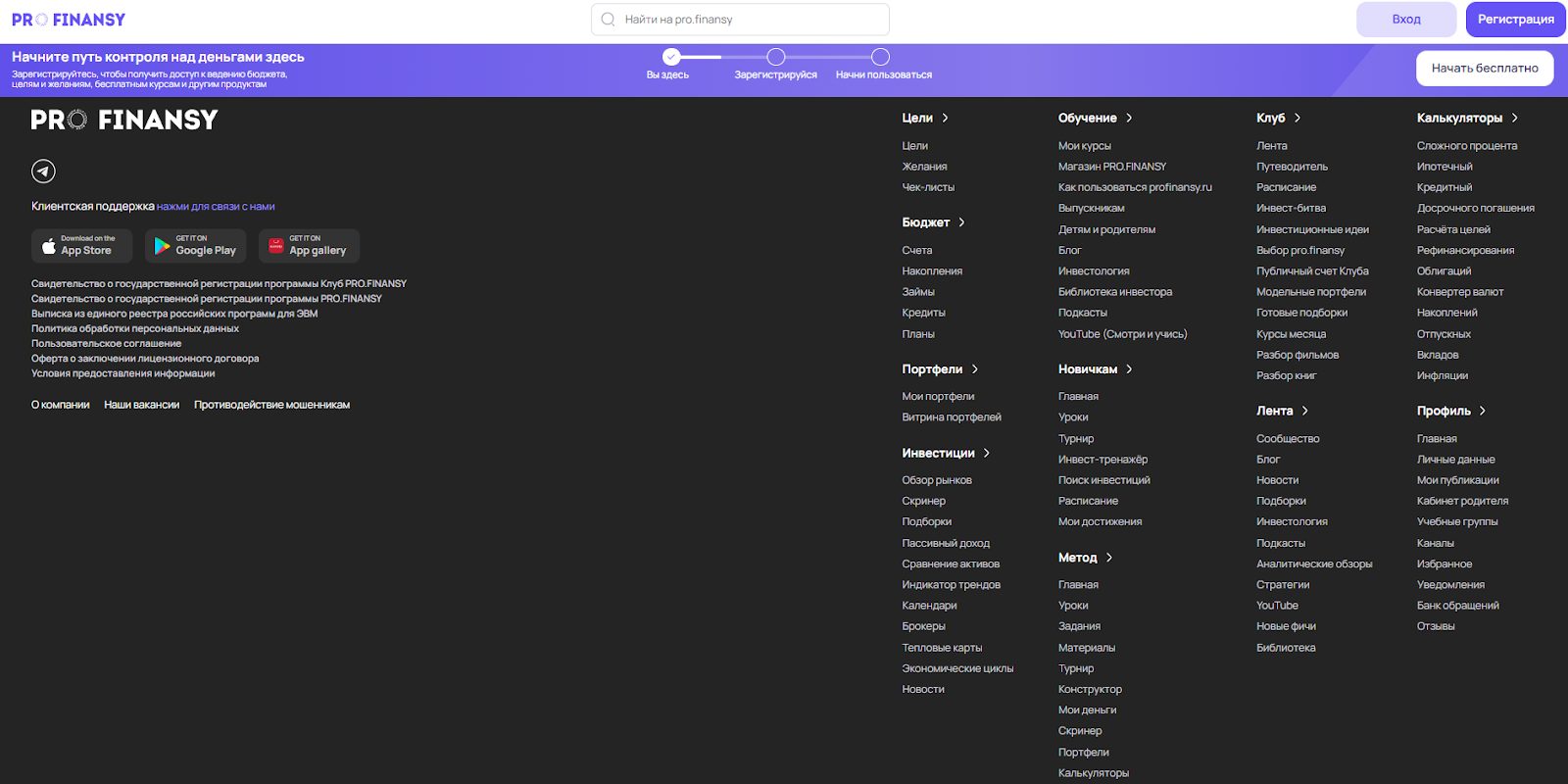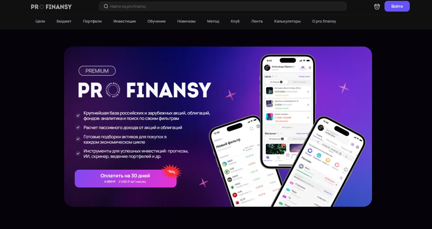 На странице ProFinansy ru представлена основная информация о проекте, курсах и школе. Там огромное количество разделов, включая портфель Ольги, материалы для новичков и различные калькуляторы дохода, но все это доступно только после оформления подписки. Она стоит 5000 рублей без скидки, но часто пользователям предлагают цену в 2500 рублей. Однако она включает ограниченный набор инструментов, остальные, типа курсов, нужно покупать отдельно.