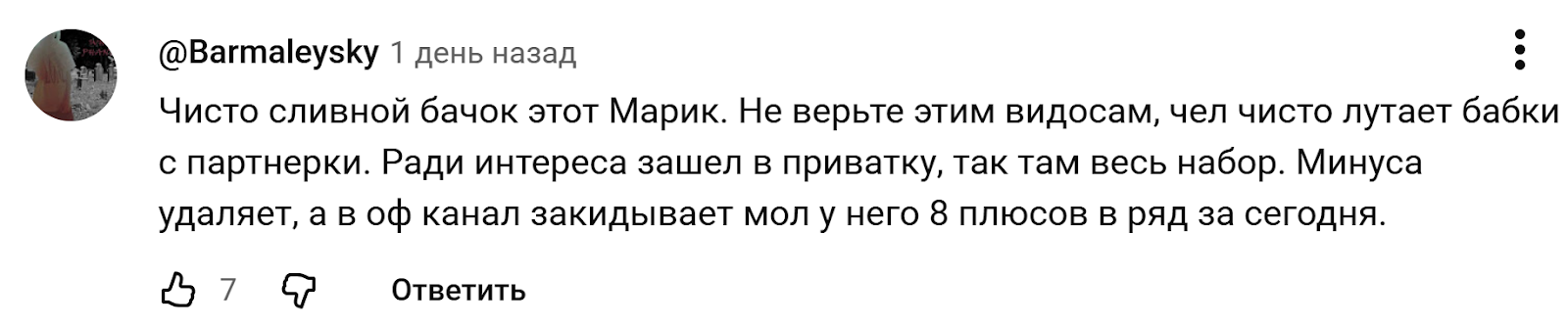Особой популярностью проект не пользуется. На сторонних ресурсах мы нашли лишь пару отзывов о тг-канале «Трейдер с Мариуполя». Причем все они негативные, аналитика называют очередным мошенником, который зарабатывает не на трейдинге, а на привлечении клиентов для нелегальной торговой платформы.