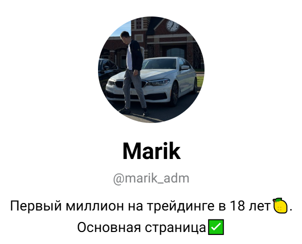 «Трейдер с Мариуполя» — каналы в Telegram и на YouTube, посвященные заработку на трейдинге. Возглавляет их аналитик по имени Марик, который говорит, что заработал свой первый миллион на торговле бинарными опционами в 18 лет, а сейчас проживает свою лучшую жизнь. Стоит ли подписаться на проект Marik Adm и чем он может быть полезен нашим читателям, разберемся в нашем обзоре.