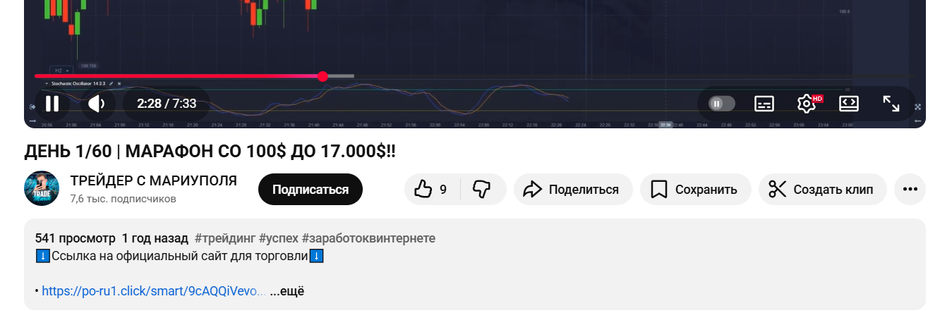 Долго «прогревать» аудиторию Марик не стал, уже в первый день существования каналов он принялся завлекать аудиторию на торговую платформу Pocket Option. Это всем известная площадка бинарных опционов, которая собрала неоднозначные отзывы в интернете. Многие пользователи сталкиваются с проблемами при выводе средств с нее.