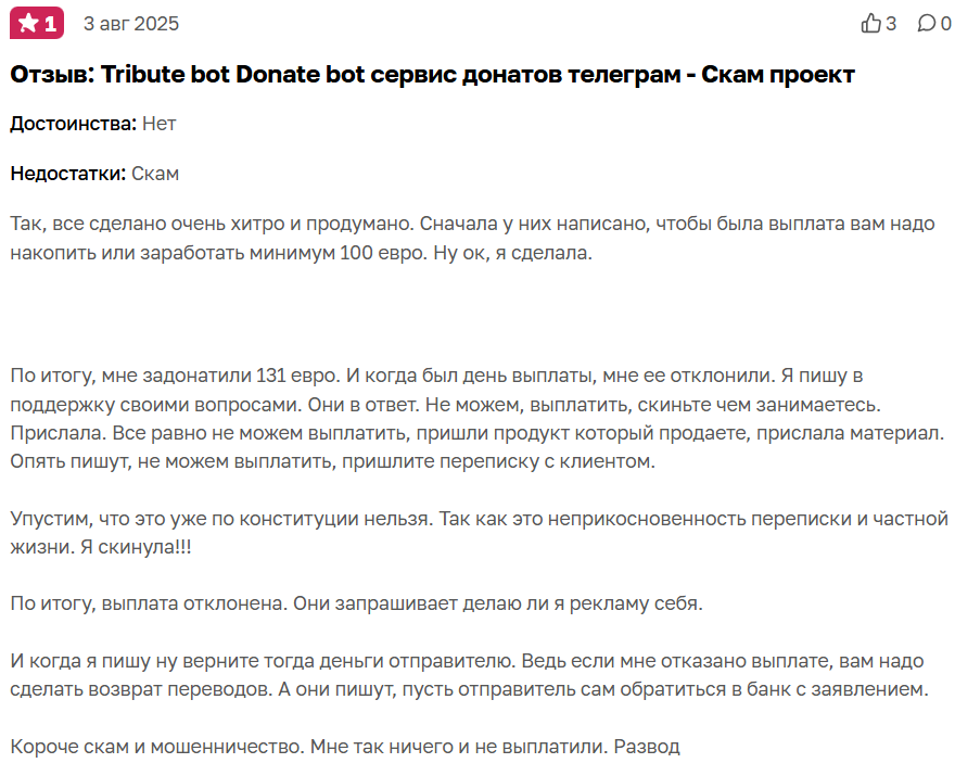 У проекта спорная репутация: довольных и недовольных пользователей примерно поровну. Встречаются вопросы о том, безопасно ли использовать Tribute для монетизации Телеграм-канала.