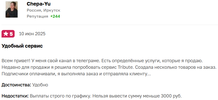 В интернете встречаются отзывы о сервисе для монетизации Телеграм-каналов Tribute. Некоторые пользователи остаются довольны проектом, утверждают, что он выполняет свои обязательства.