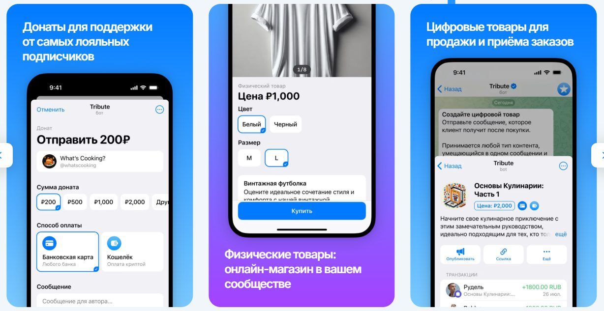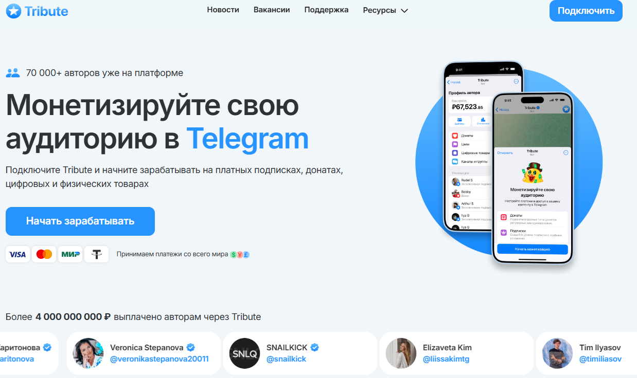 Сервис Tribute запустили в сентябре 2025 года. Он предназначен для авторов Телеграмм-каналов, которым предлагает возможность принимать донаты или организовать платную подписку на контент непубличных каналов.