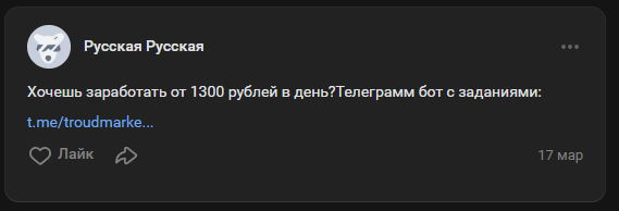 Troudmarke bot — это телеграмм-проект, в котором пользователям обещают высокооплачиваемую работу. Авторы бота предлагают выполнять задания по взаимодействию с группами и публикациями в различных социальных сетях. Этот сервис получил негативную репутацию в сети, поэтому мы проверили его на развод.