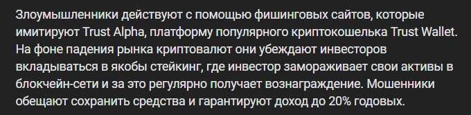 Сайт Траст Альфа не имел отношения к инвестициям в криптовалюту, а был обычным скамом, замаскированным под известный сервис. У него были характерные для мошеннических проектов минусы: