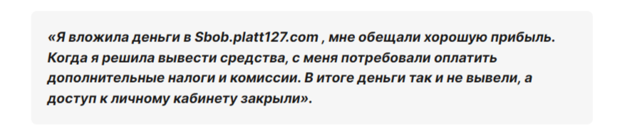 Все вышеперечисленное свидетельствует о мошенническом характере брокера. Мы не рекомендуем сотрудничать с Platt127. В комментариях расскажите о своем опыте работы с Tsb Platt127.