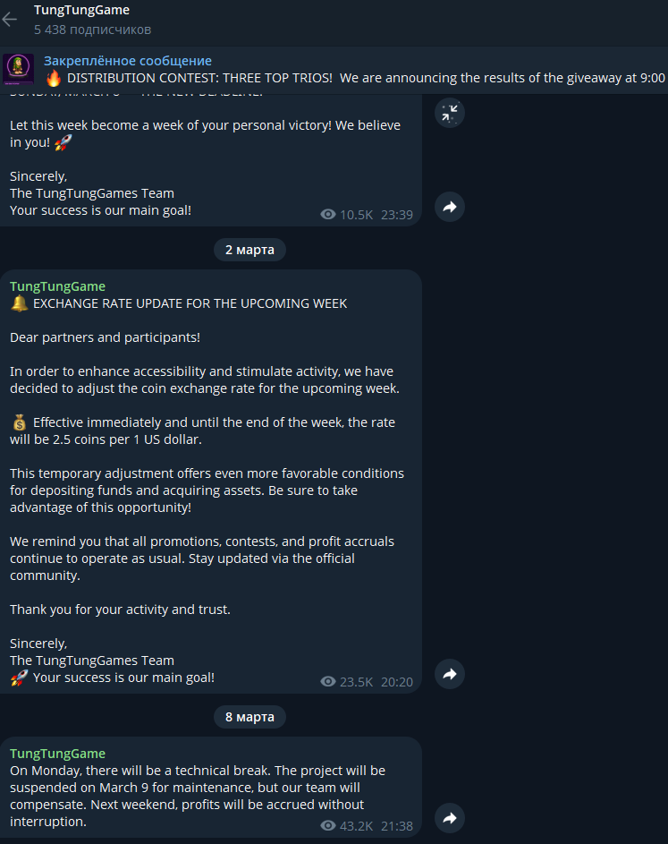 Зашел в Tung Tung Friends через телеграм подписался на канал потому что иначе бот не запускается. Внутри предложили вложить 25USDT на 7 дней с доходностью как сказали 20%. Я перевел деньги активарол вклад а в итоге доход начислялся якобы но когда срок закончился и как бы пора выходить у меня с баланса тупо все исчезло и вся прибыль и депозит весь мой вместе с ним.