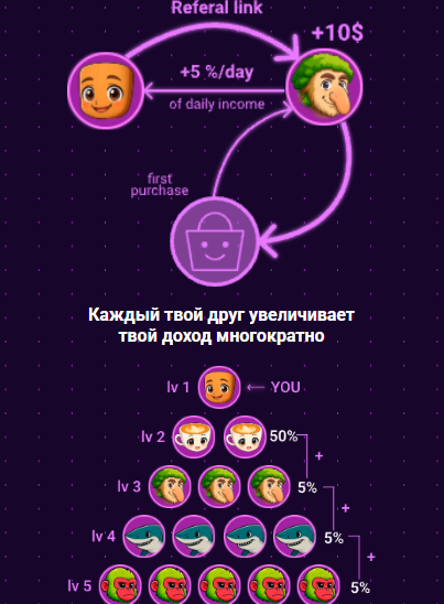 Развитая реферальная система с пятью уровнями партнеров. где каждый друг “увеличивает доход многократно” тоже ни о чем хорошем не говорит. Все пирамиды существуют за счет новых партнеров, здесь ситуация ровно такая же.
