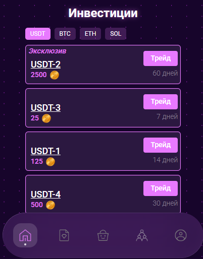 В самом мини-аппе нам предлагают совершать инвестиции в различные вклады. Например, пользователь может вложить 25 USDT на 7 дней, а по истечении этого срока получить 20% прибыли. Каким образом вообще устроена эта система и за счет чего формируется доходность – неясно.