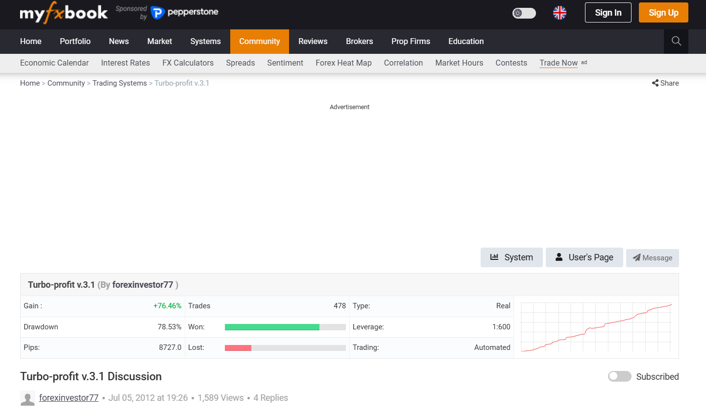 «Турбо Профит» является сеточным роботом, который работает по системе Мартингейла, и именно поэтому он рекомендуется трейдерам с крупным стартовым депозитом. Кто является разработчиком Turbo Profit, к апрелю 2026 неизвестно, первая публикация в интернете, связанная с ним, появилась 5 июля 2012 года на MyFxBook от пользователя под ником forexinvestor77. Другие юзеры начали предполагать, что именно этот трейдер является создателем, но подтверждений нет.
