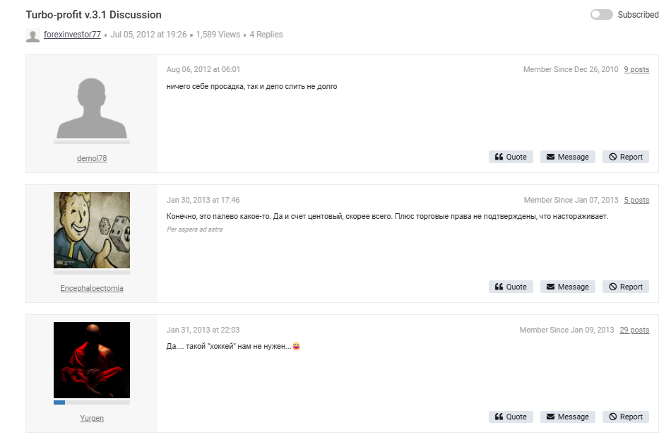 В сети можно найти обсуждения реальных пользователей. Так, люди в отзывах о Turbo Profit v 3.1 отмечают большие просадки, один из пользователей заподозрил в статистике обман. Кто-то предположил, что в основу статистики лег небольшой счет, и никак проверить именно это нельзя.