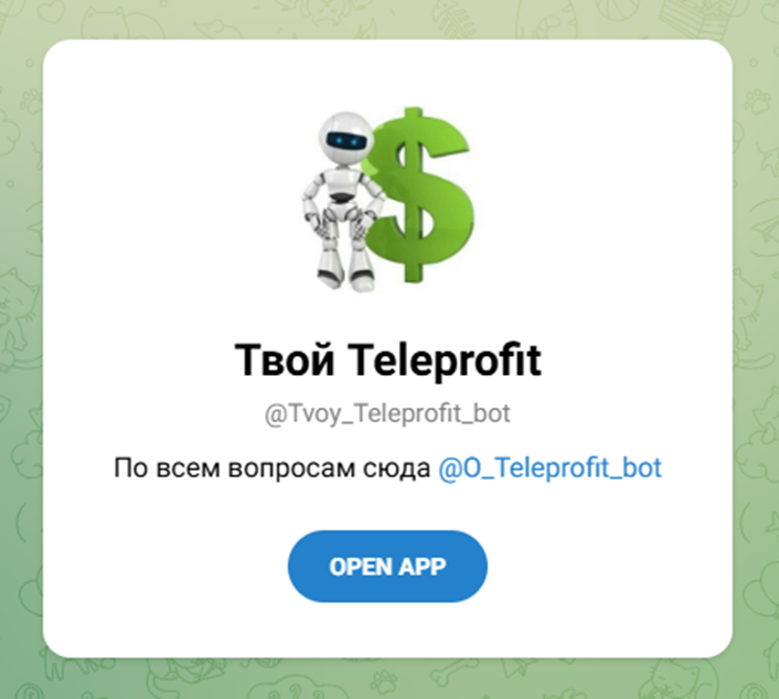 Можно найти более ранние редакции одноименного проекта «Твой Teleprofit», причем до момента перехода по указанной в обзоре ссылке даже не подозреваешь, что тебя перекидывает каждый раз в новый бот. Функционал у всех ресурсов абсолютно идентичен, но ссылки на аккаунты и «аватарки» разные. Администрация Телеграма одним уже присвоила статус «скам», другие продолжают свою деятельность. Но в обзорах их уверенно относили к «ботам, которые платят» и в «ТОП ботов для заработка в Telegram».
