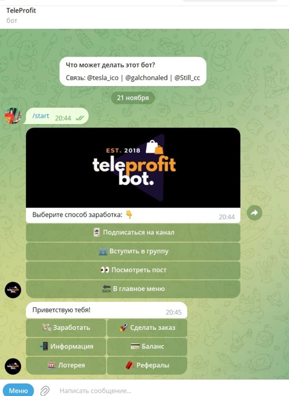 В рекламе самого канала так и пишут: «заказывайте подписчиков в нашем боте, все подписчики живые люди, которые подписываются за вознаграждение». Мини-приложение @Tvoy_Teleprofit_bot вначале требуется запустить. Из существующих в сети обзоров понятно, что платит сервис за следующие действия: